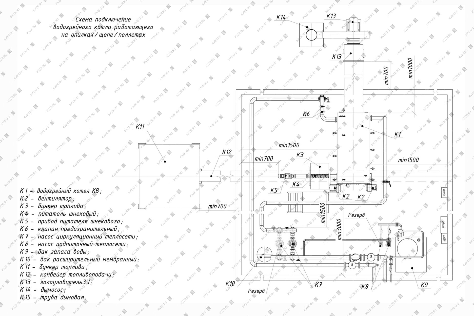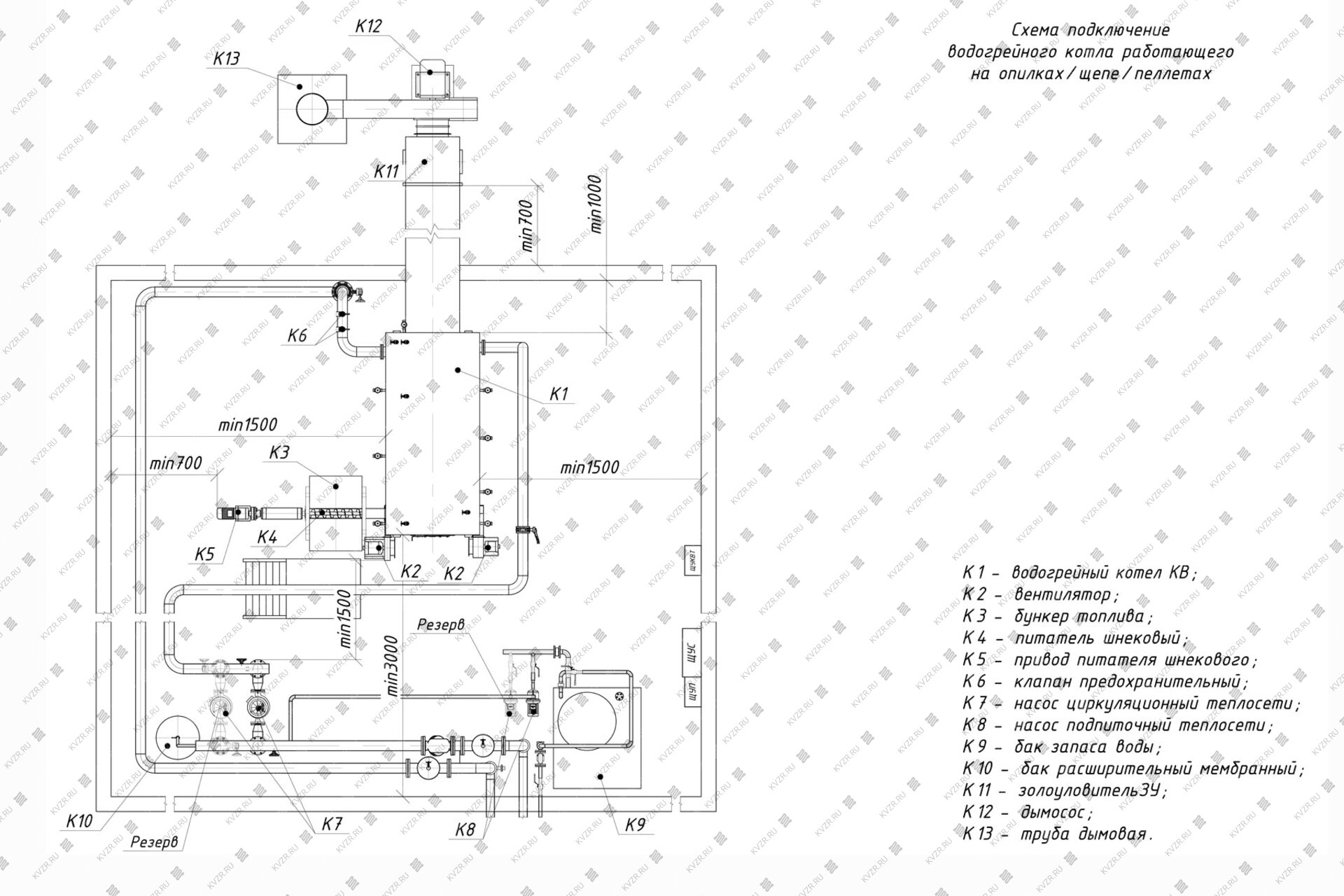 Чтобы правильно подключить пеллетный котел 0.8 МВт в котельной необходимо оставить проемы для обслуживания оборудования во время эксплуатации. На представленной здесь схеме указаны их минимальные размеры. Кроме того, в данной примерной схеме монтажа водогрейных котлов и оборудования указан перечень минимально необходимого вспомогательного оборудования для правильной работы котла.
