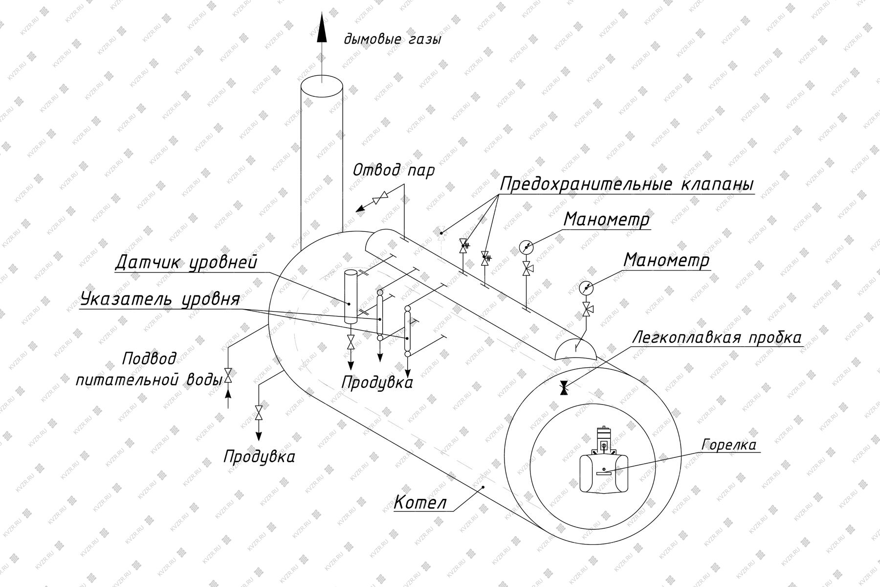 Передняя часть внутреннего цилиндра (жаровой трубы) оборудована топкой. Чтобы предохранить наружные стенки агрегата от высоких температур, их отделяют от камеры сгорания защитным теплоизоляционным слоем. Для обеспечения безопасности и снижения давления в стальном жидкотопливном парогенераторе, его оборудуют специальным взрывным клапаном. В задней части жаровой трубы расположен трубный конвективный пучок и дымовая труба, через которую удаляются продукты сгорания.